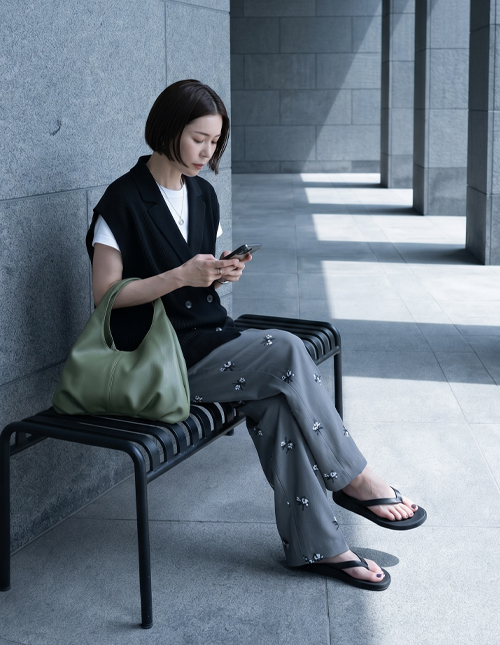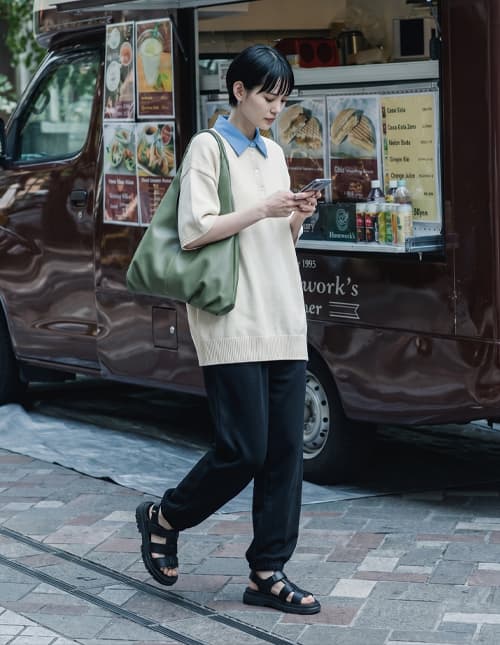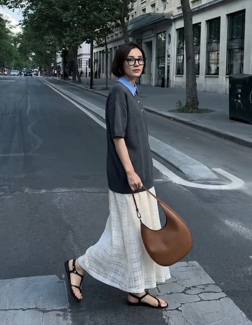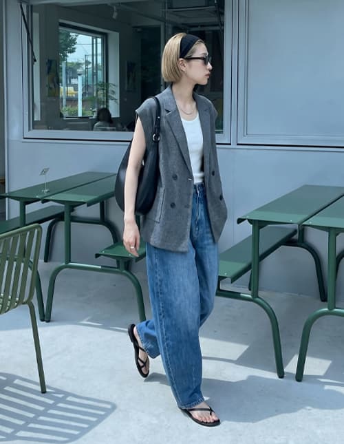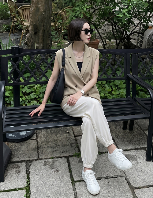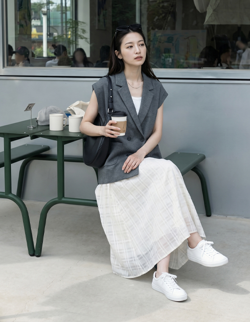 レイヤード上手な人は、なぜか「3枚着ている」ことを感じさせない。オフホワイトのシアートップスにブラックのベスト、チャコールグレーのワイドパンツ——文字にすると重たいのに、着てみると驚くほど軽い。秘密はシアー素材の透け感。重ねているのに「抜けて」いる、この矛盾こそがおしゃれの面白さだ。くったりショルダーバッグを斜め掛けにした瞬間、鏡の中の自分が「なんか今日、いい」と囁いてくる。コーデに迷ったら、まずベストを一枚足してみる——それだけで昨日と違う自分に出会える。