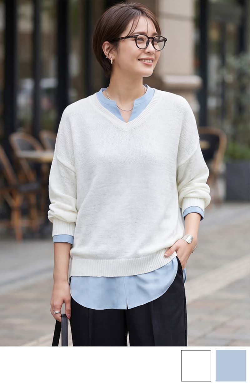 ネイビーのワントーンに、サックスブルーのシャツがひと筋の光を差し込む——映画のワンシーンのような配色バランスに、思わず目を奪われる。ディープVネックベストが描くシャープなラインと、プリーツスカートの揺れるフェミニンさ。相反する要素が同居するから、このスタイルには「知性」と「色気」が共存する。広尾の隠れ家ビストロにも、六本木ヒルズのアートイベントにも。ネイビーを制する人は、東京のおしゃれを制する。
