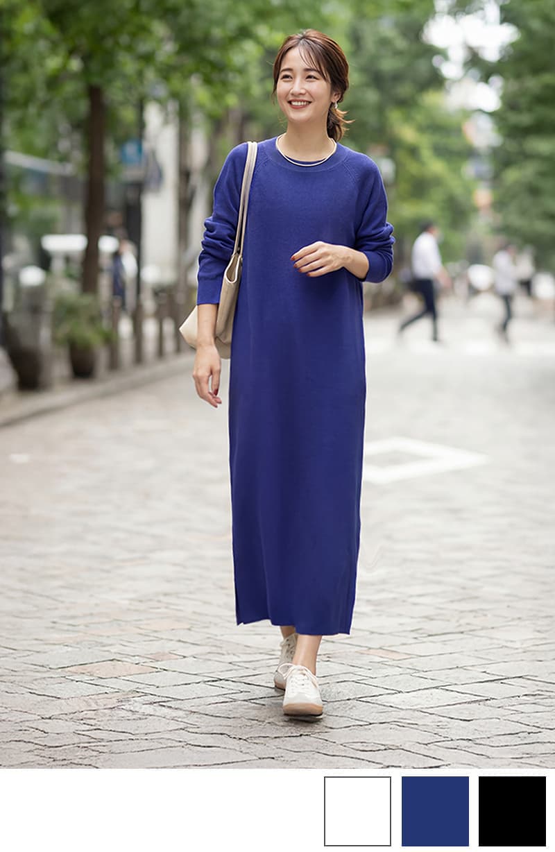 街角の古い建物を背に、エクリュのブルゾンを肩にふわりと羽織る。ブラックのサーマル編みワンピースは、その編み地の表情だけで一枚で主役を張れる存在感。そこにエコスエードのやわらかなブルゾンを重ねることで、モードになりすぎず、街歩きにちょうどいい軽やかさが生まれる。ミニバケットバッグをぎゅっと手に持てば、クラシカルな街並みにも溶け込む洒落たバランスに。肌寒い朝と暖かい午後、一日の気温差にも対応できるレイヤードの実力派コーデ。