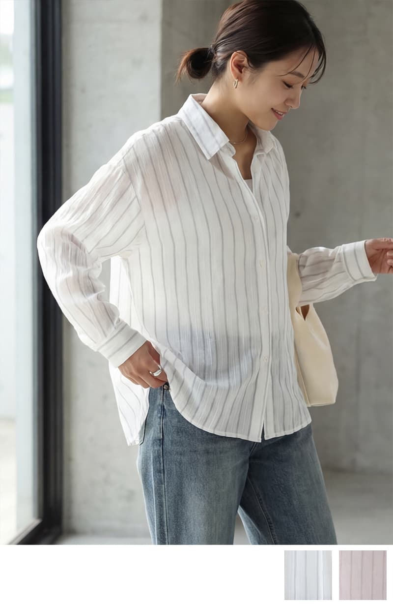 モーヴピンクのストライプシャツが、いつものブラックスカートを一瞬でアップデートする——表参道のビストロで窓際席に着いた瞬間、エアリーな透け感がふわりと揺れて、視線を集める主役級の存在感。ジョーゼットのストレートスカートが描く縦長ラインに、ダークオークのパテントパンプスとレザーショルダーが品格をプラス。甘さと洗練が同居する、大人のピンク使いの正解がここに。