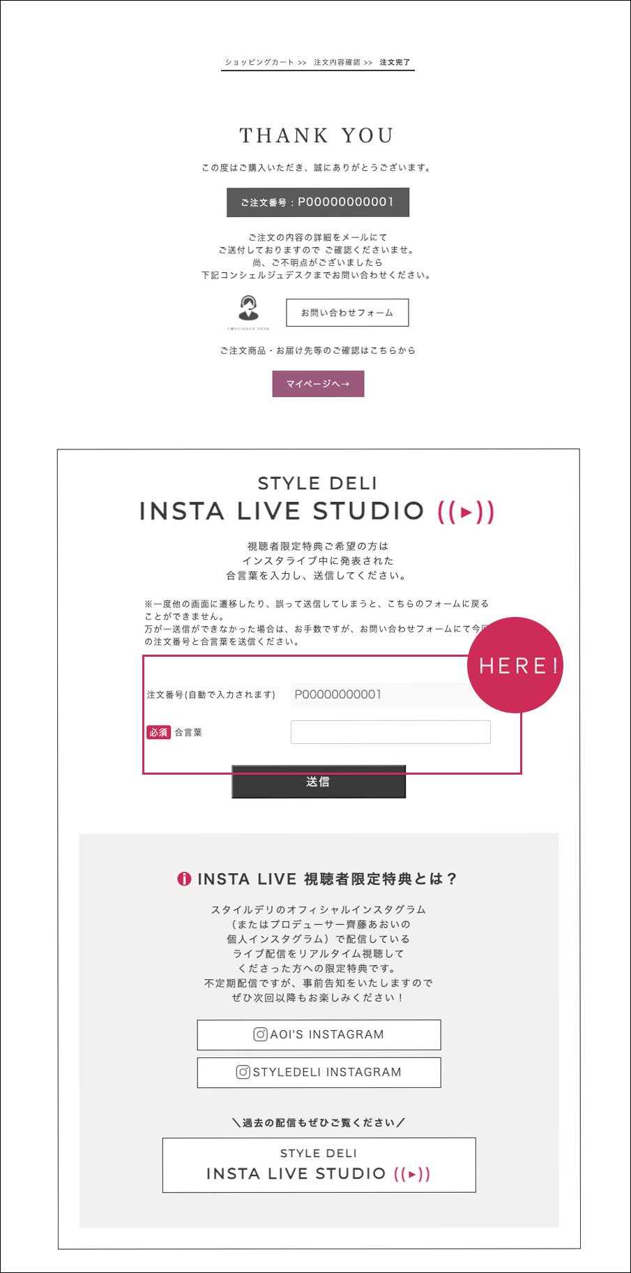下記の対象アイテムを購入し、 購入完了画面に設置されたフォームから 「ご注文番号」と LIVEで発表した「合言葉」を 記入して送信すると、 後日1000ポイントプレゼント! ※特典の受取りには会員登録が必要です。