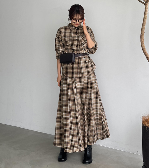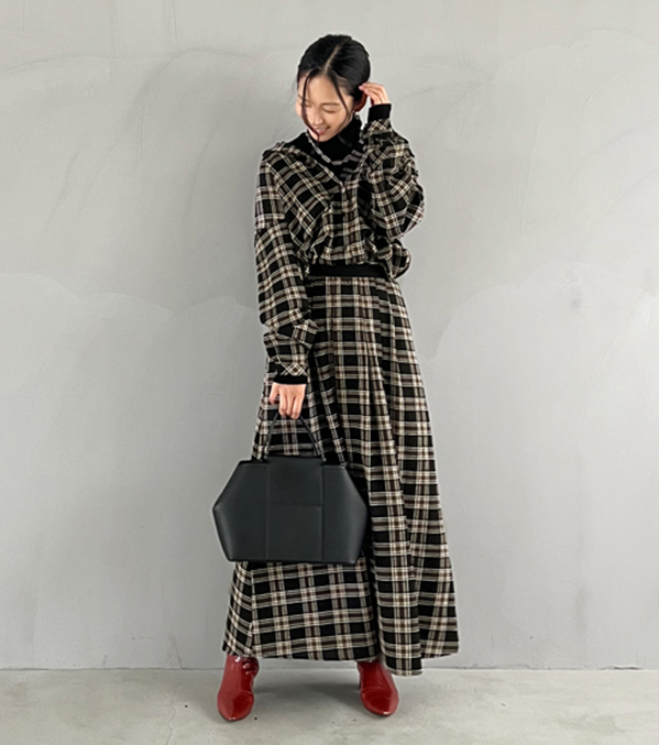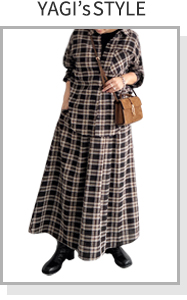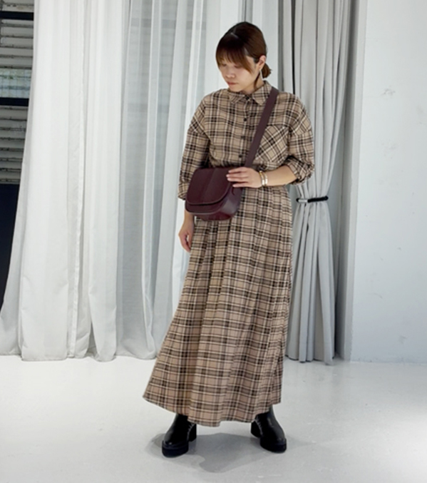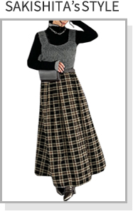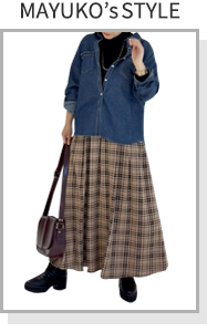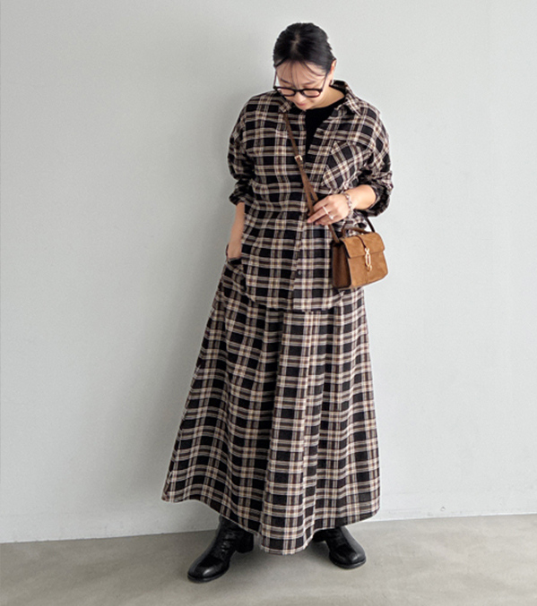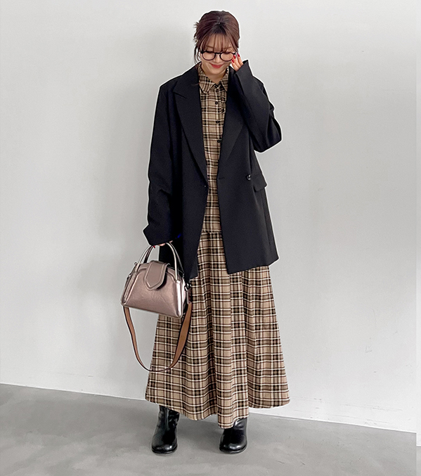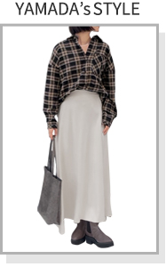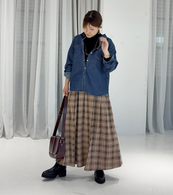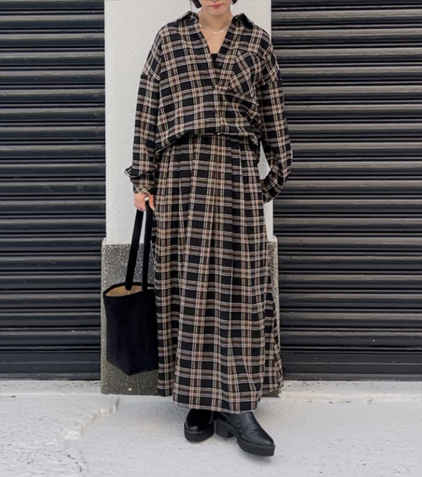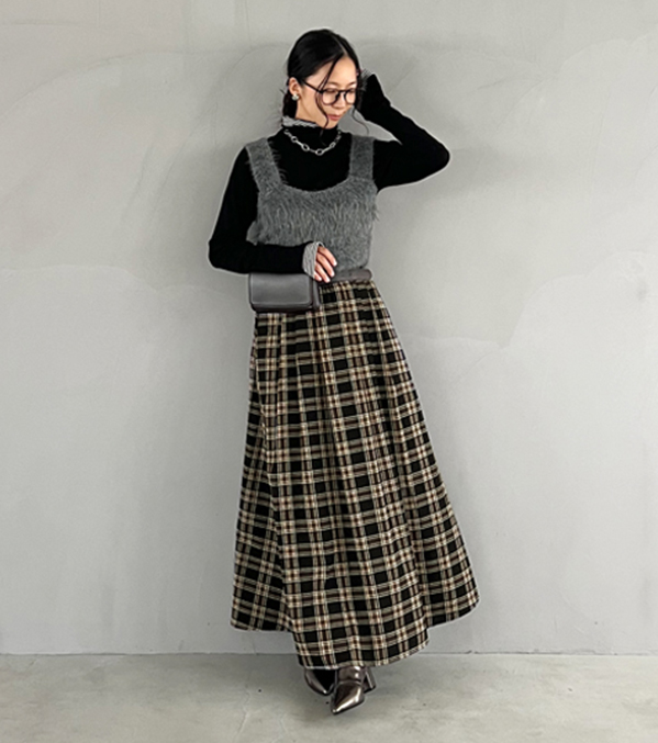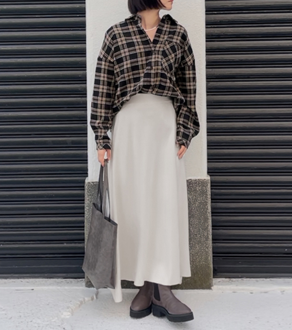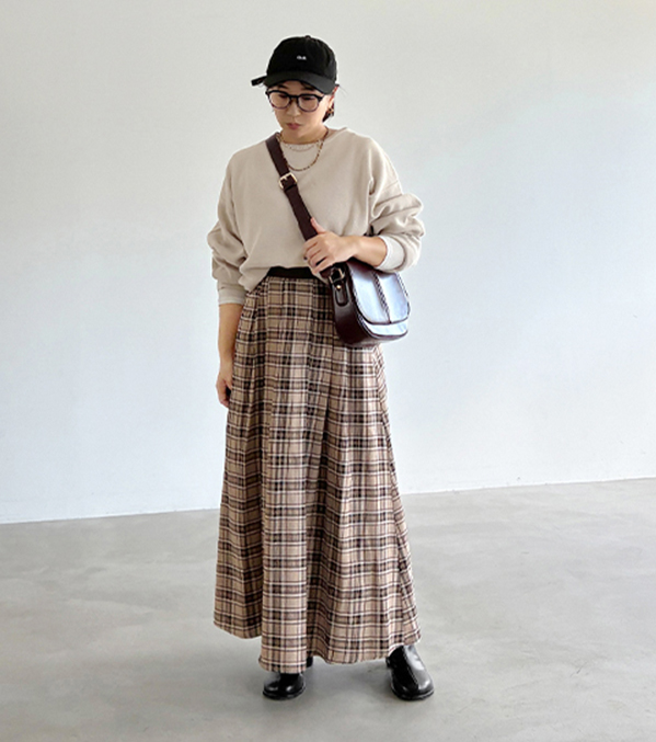 チェックスカートをメインにモノトーン×グレーで落ち着いた大人カジュアル。