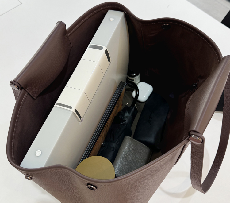 長財布やポーチ、折り畳み傘等の普段使いグッズはひと通り収納できます。A4サイズ書類は不可。タテ入れした場合3、4cm程はみ出します。
