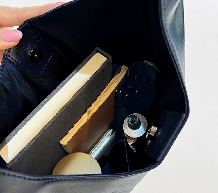 長財布やポーチ、折り畳み傘等の普段使いグッズはひと通り収納でき、カーディガンなどの羽織りも入ります。