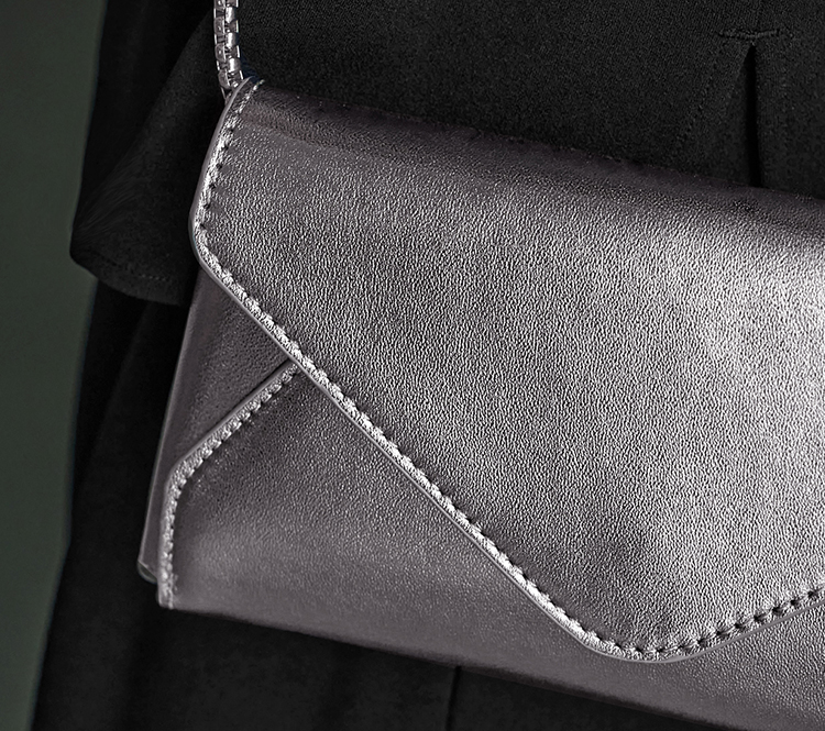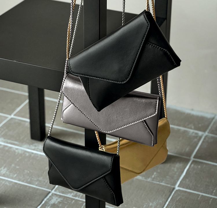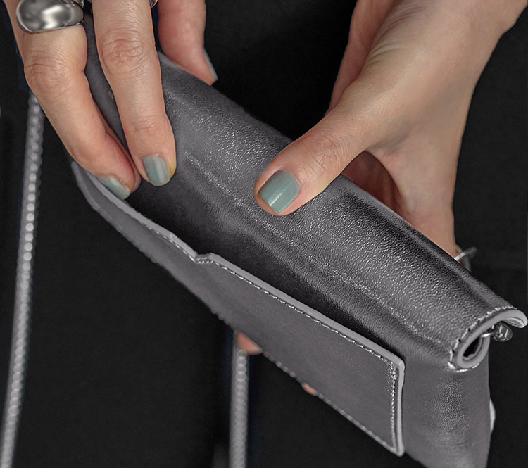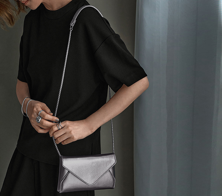 絡まない管状チェーンのトップにはレザーの肩当てを付け、長財布程度の重みで、ストレスにならない着け心地を目指しました。