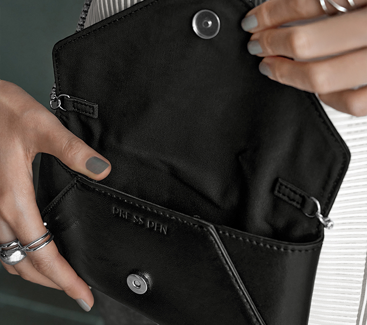 携帯電話(あるいはミニ財布)とリップと目薬と鍵くらいの、ちょっとした小物が収納できる容量です。