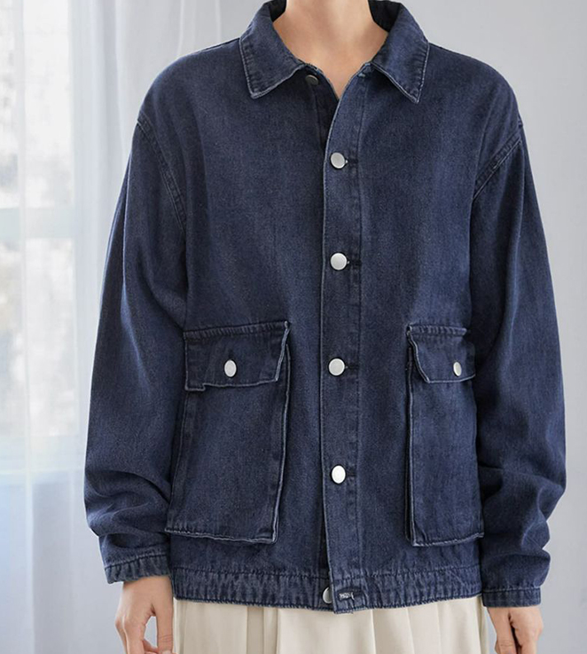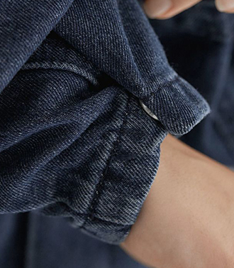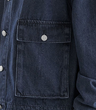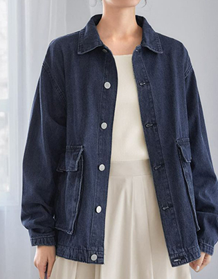 大きなフラップ付きポケットがデザインの ポイントになった、デニム素材の襟付きジャケット。 Gジャンというよりはワークジャケットのような デザインですが、使い方はGジャンと同様に 使えて着た際の雰囲気も似ています。