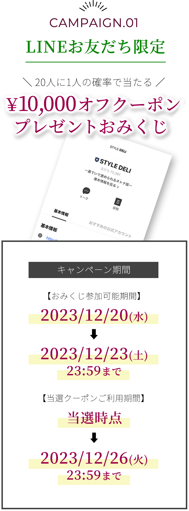 ・2023/12/20(水)12:00時点でSTYLE DELIのLINE公式アカウントをお友だち追加されていない場合、キャンペーンにはご参加いただけません。