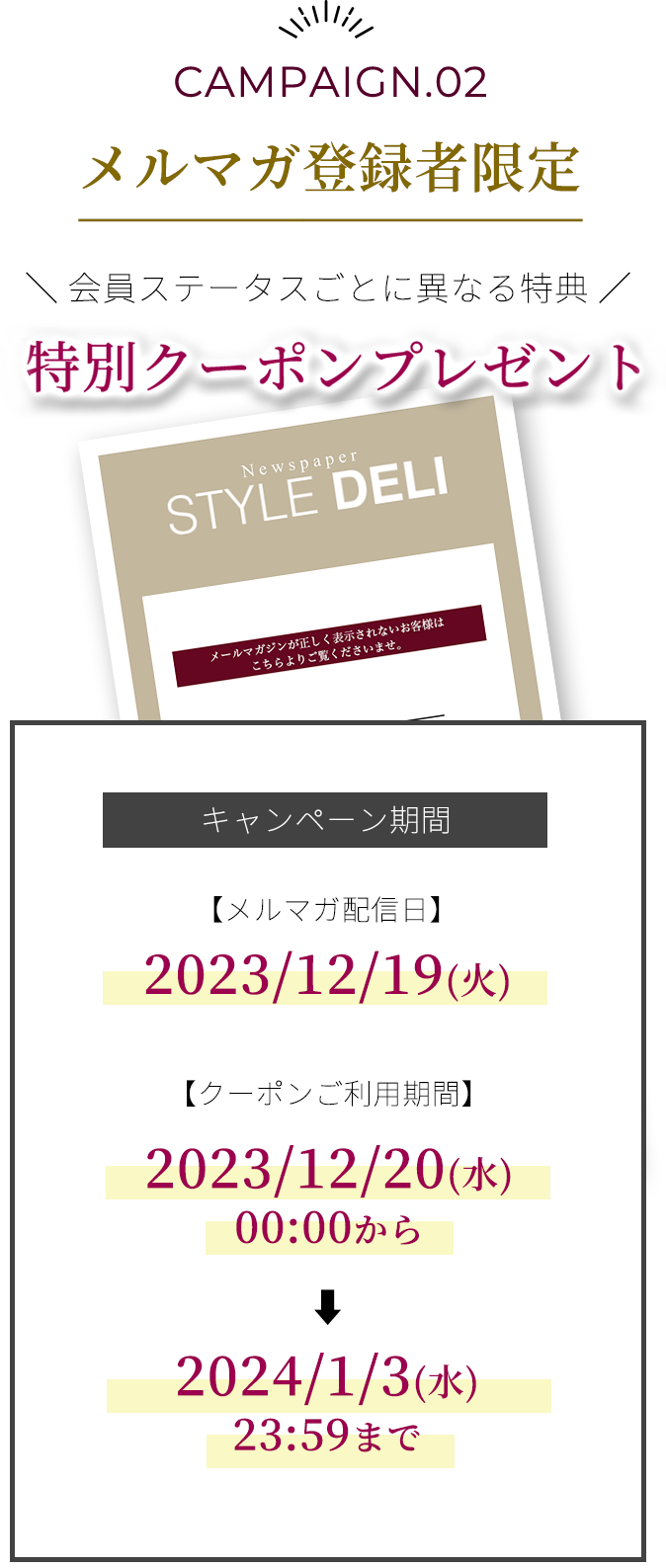 ・2023/12/18(月)までに、メルマガ配信を「可」に設定していただいた会員様限定で、会員ステータスに応じたクーポンをお配りいたします。