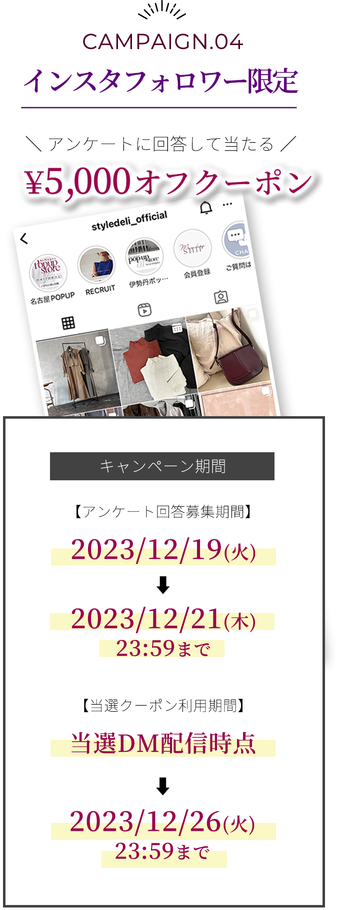 ・アカウントをフォローし、かつアンケートに回答くださった方の中から抽選で5名様に¥5,000オフクーポンのクーポンコードをインスタのDMにてプレゼントいたします。 - 注意事項