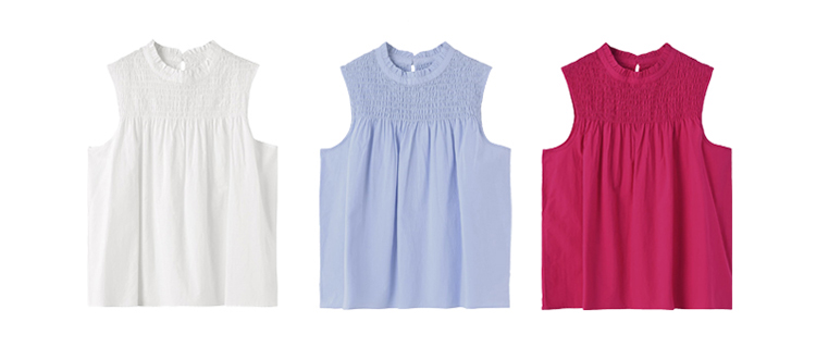 シャーリングゴムをデザインの主役にした、夏らしい質感のノースリーブブラウス。ずいぶん前に販売していたこのブラウスのサンプルを久しぶりに見て、今見てもやっぱり可愛い!と感じたので製作をした復刻デザインになります。
