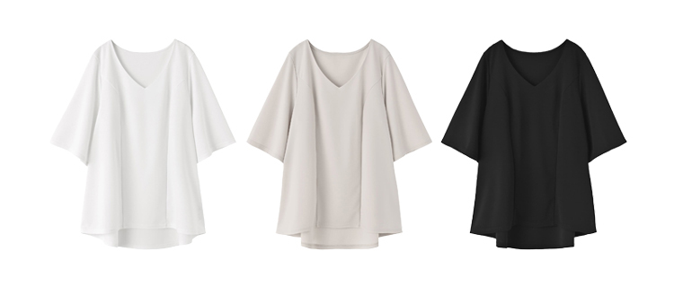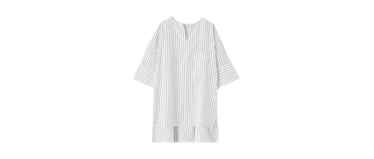 デザイン自体は潔いほどにシンプルなのですが、かえってそのシンプルさが珍しく、使い勝手が良いという特徴があります。着心地は涼しく、とくに流行りとも関係がなくずっと使える一枚。裾は出して着るトップスなので、ウエストに裾インが苦手な方にも向いています。